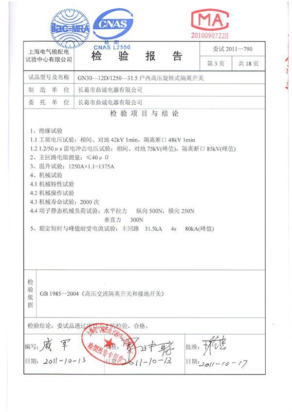 GN30隔离开关检验报告长葛市鼎诚电器有限公司