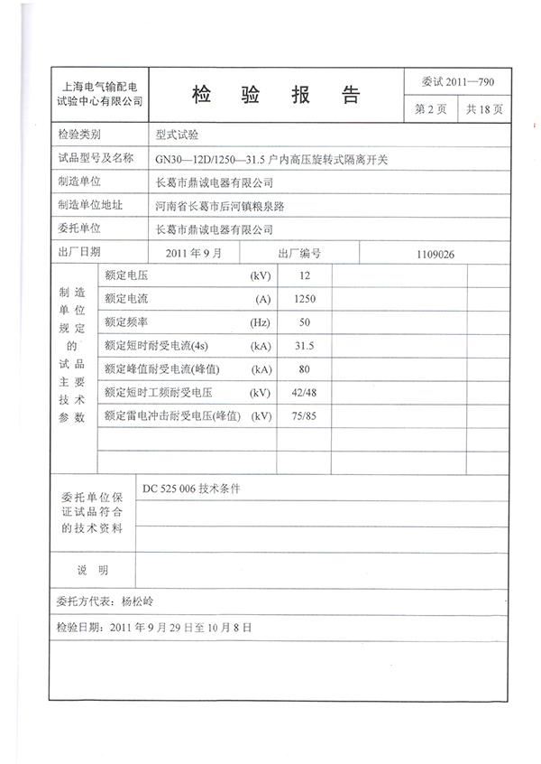 GN30隔离开关检验报告长葛市鼎诚电器有限公司